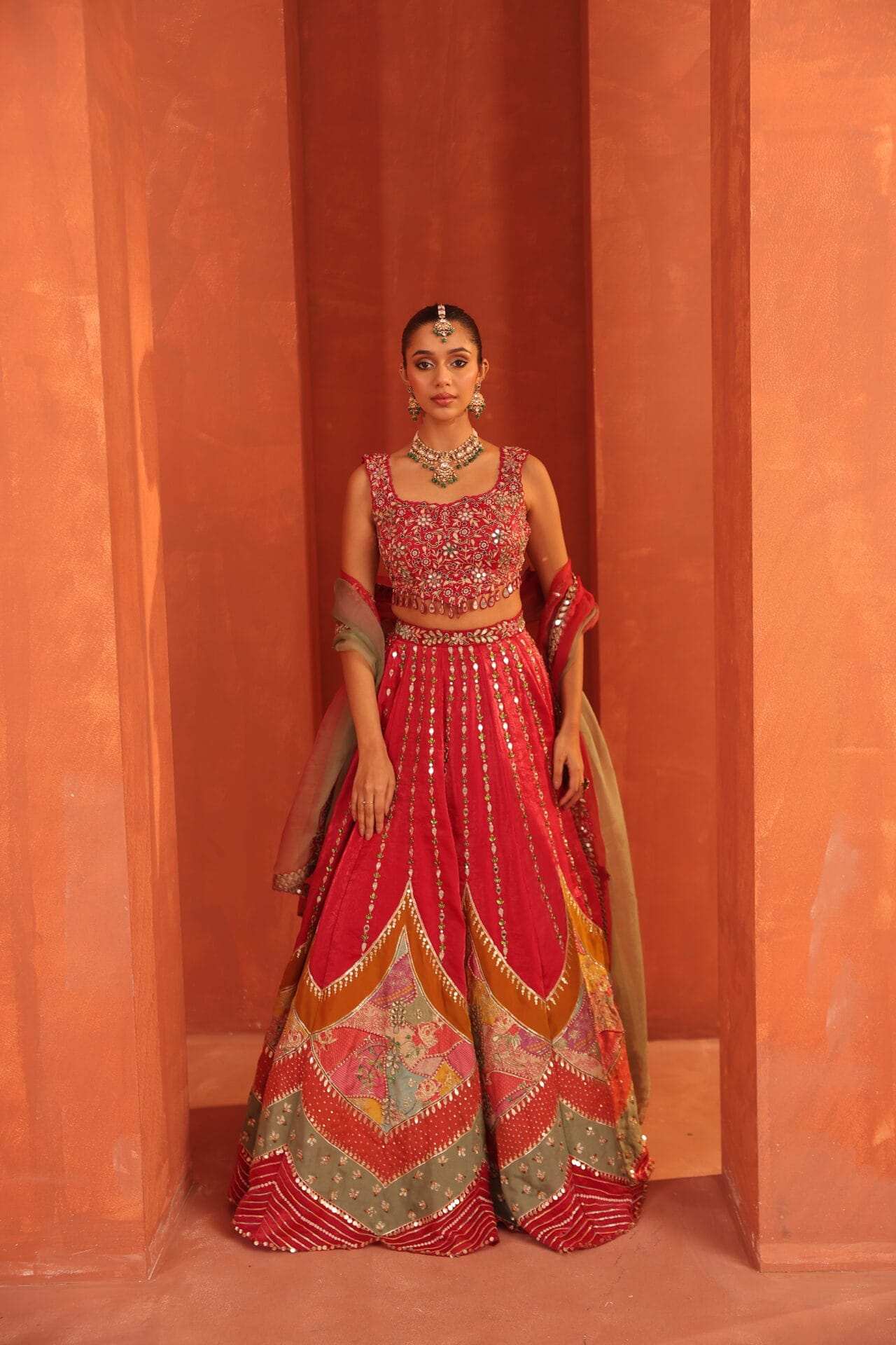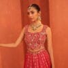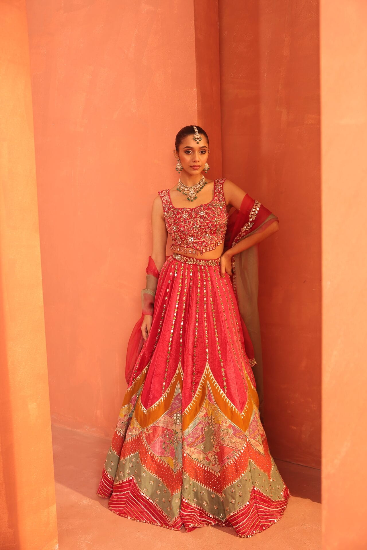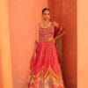 A luminous pink tissue lehenga layered with intricate applique panels,enriched with mirror and hand embroidery.Paired with a fluid ombre dupatta this ensemble blends sculptural craftsmanship with etreal movement.