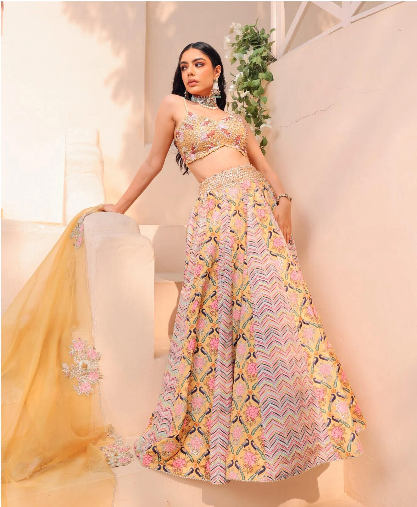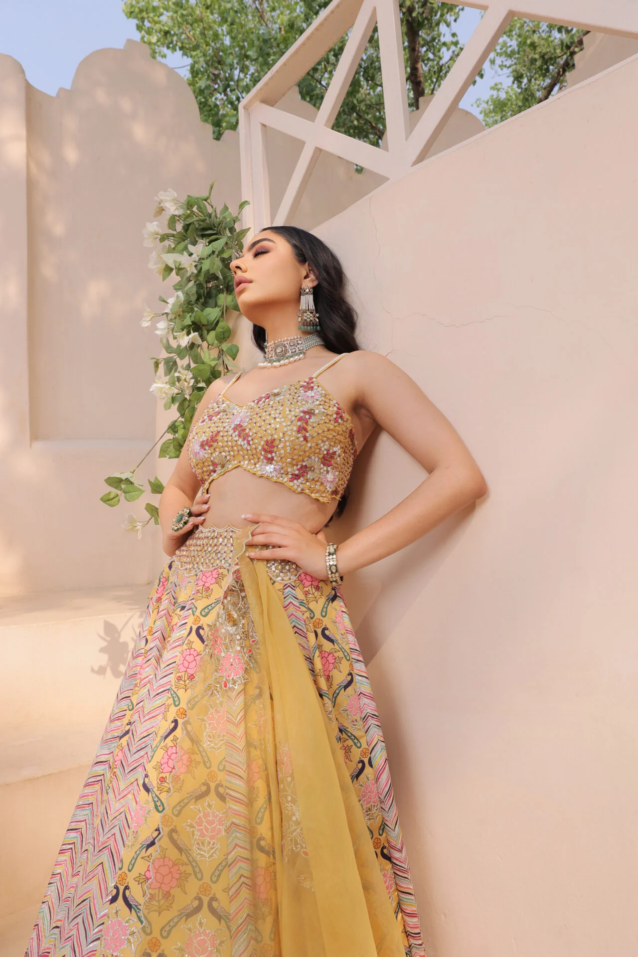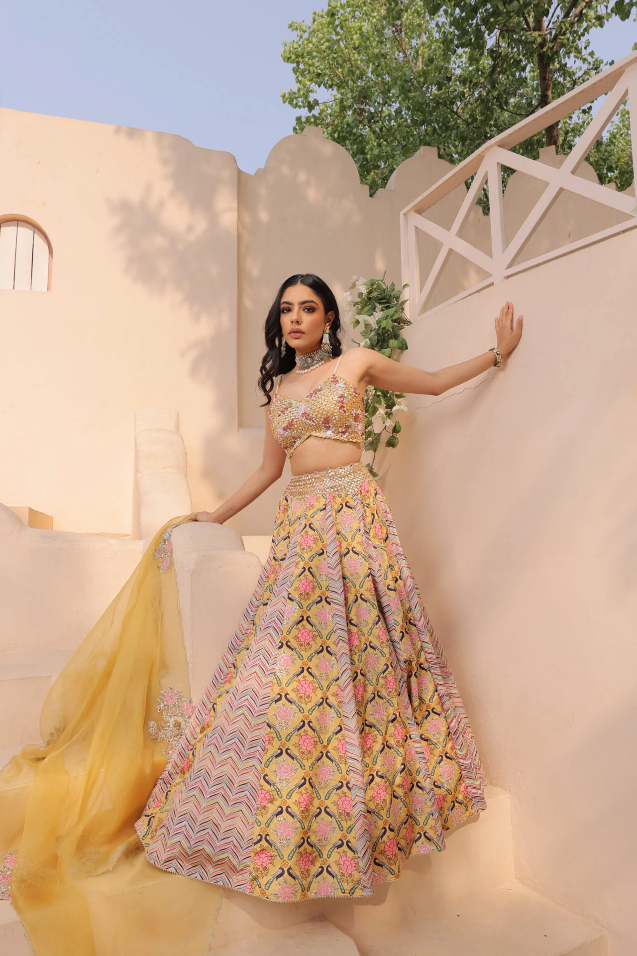 Yellow printed lehenga with gota,seqeunce and bead embroidery. Comes with a hand embellished blouse and cutworked organza dupatta.