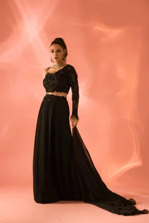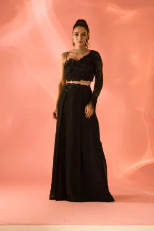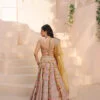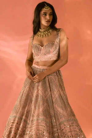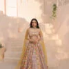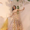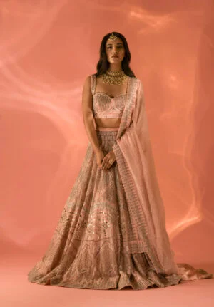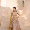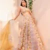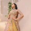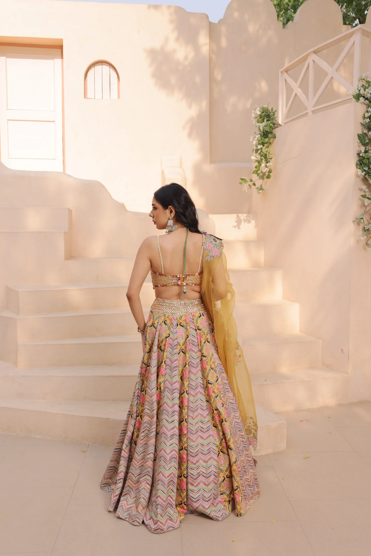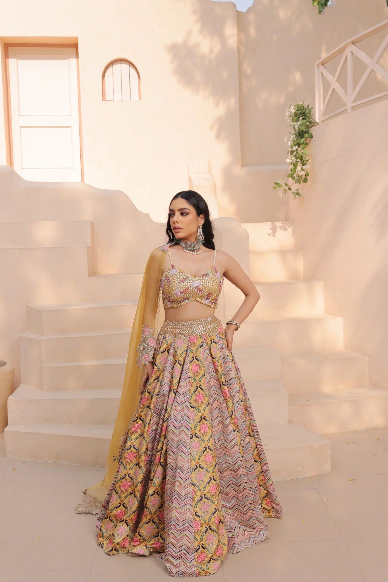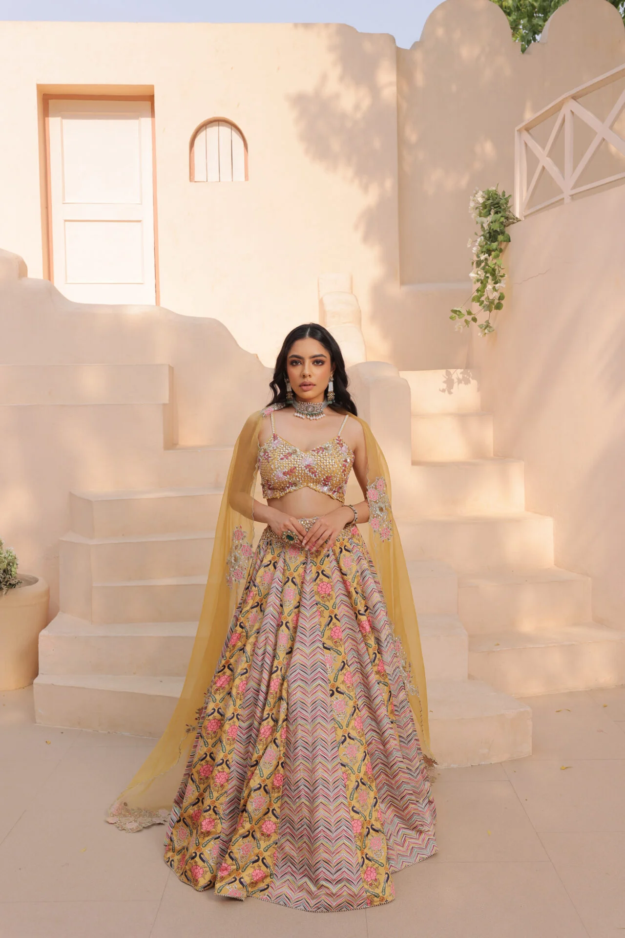 Yellow printed lehenga with gota,seqeunce and bead embroidery. Comes with a hand embellished blouse and cutworked organza dupatta.