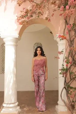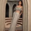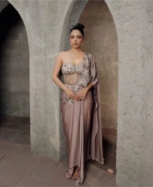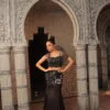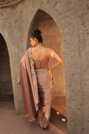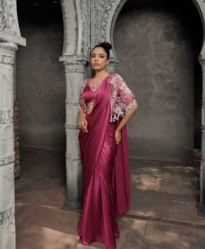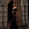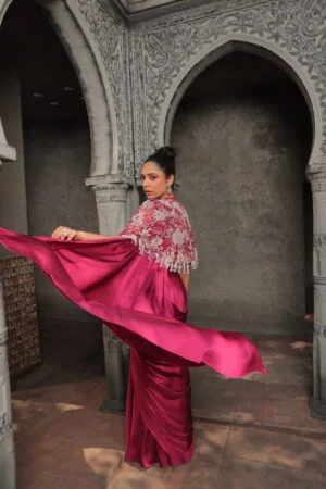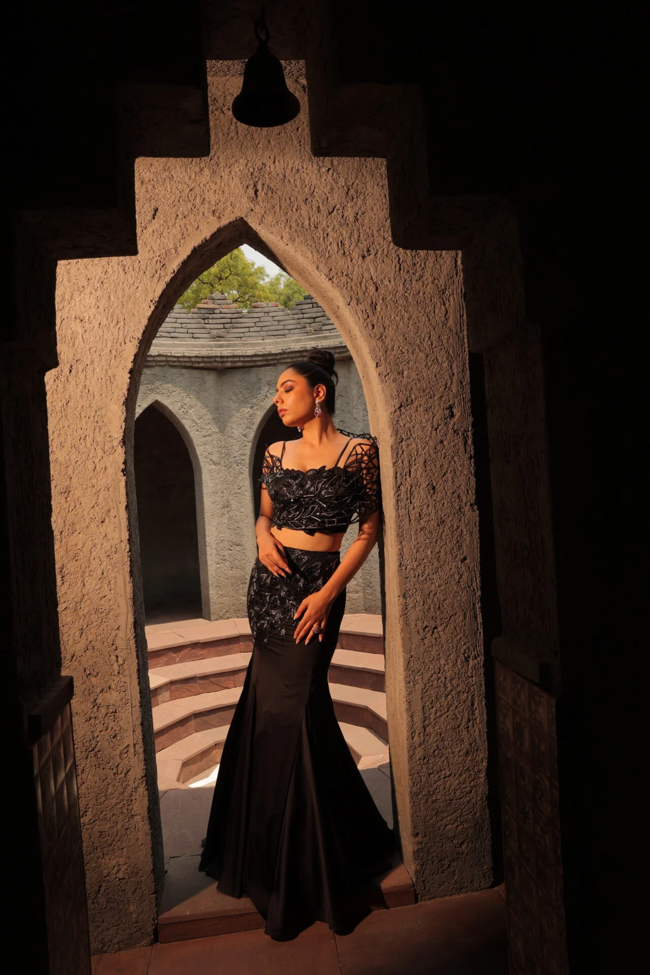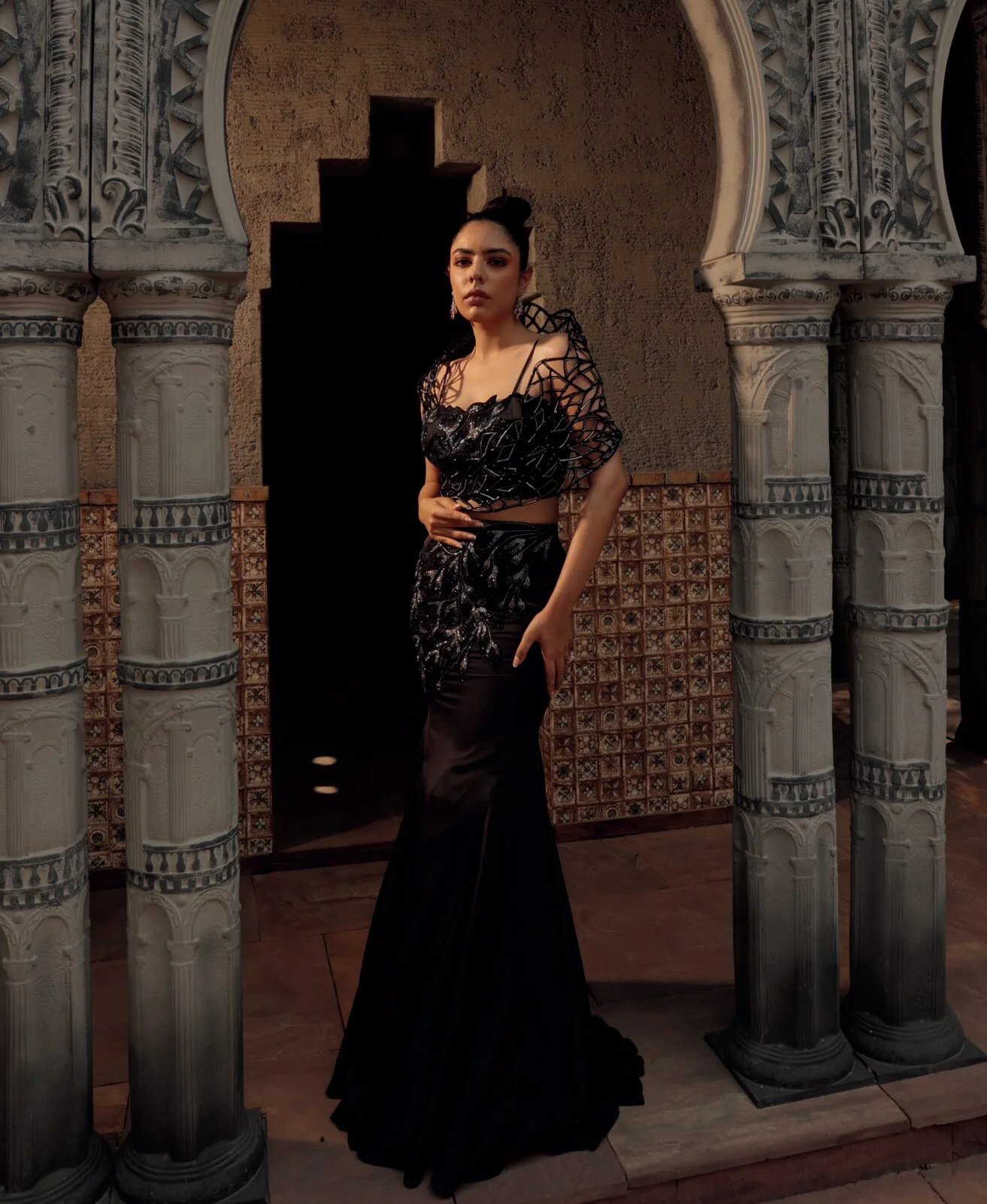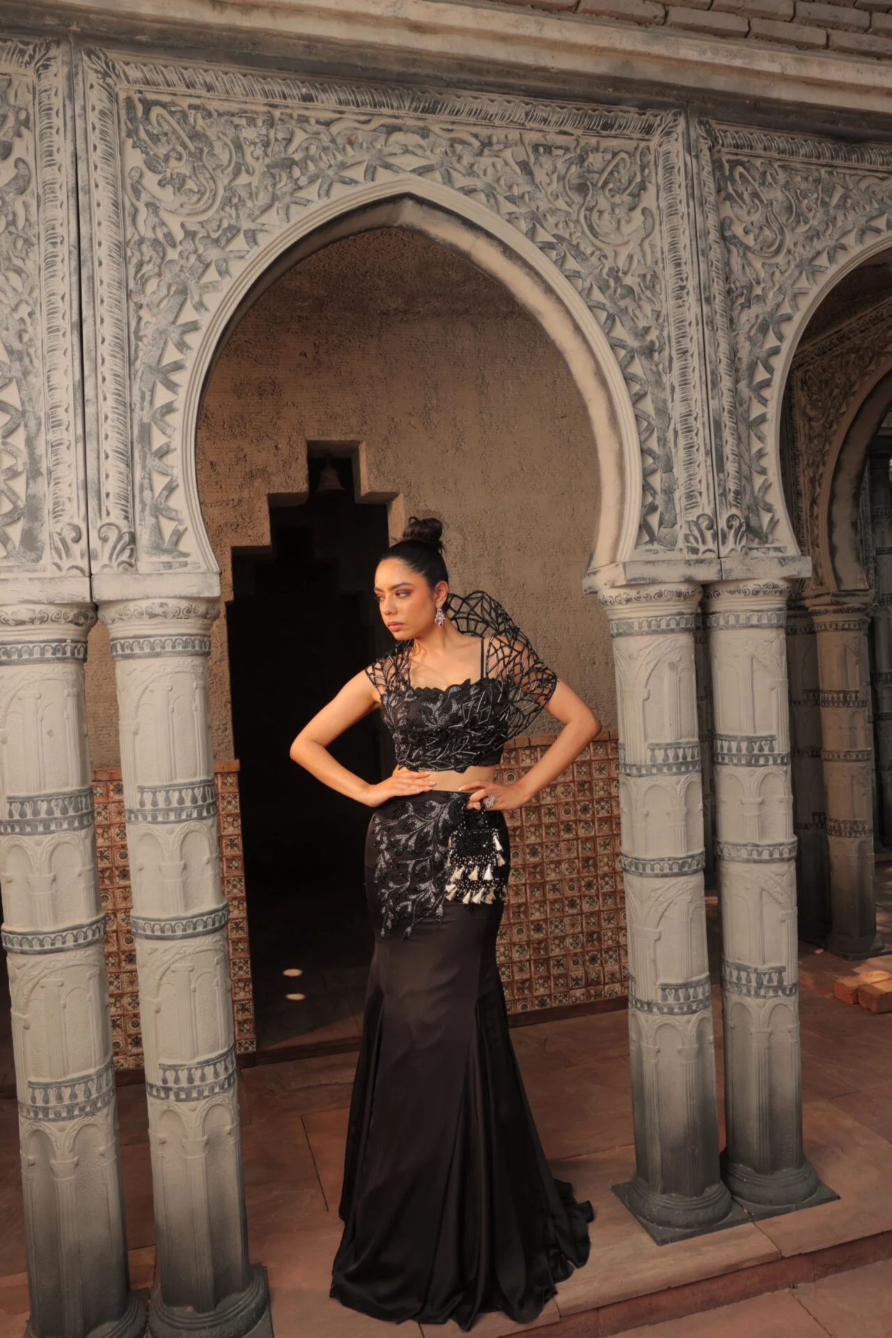 Featuring Black fish cut skirt with ombre embroidery and wrap blouse with 3D cape.