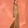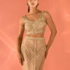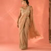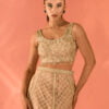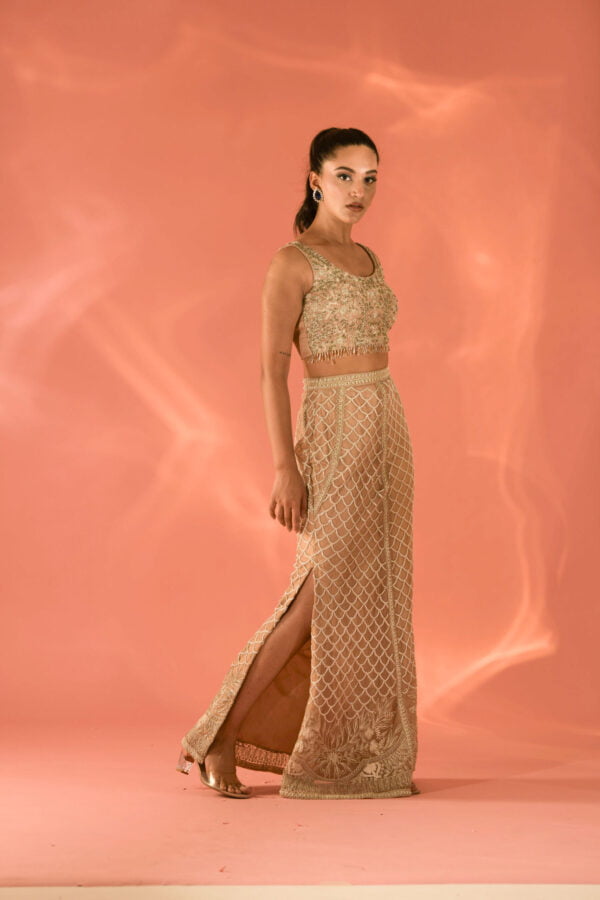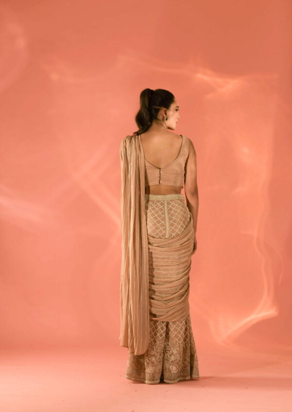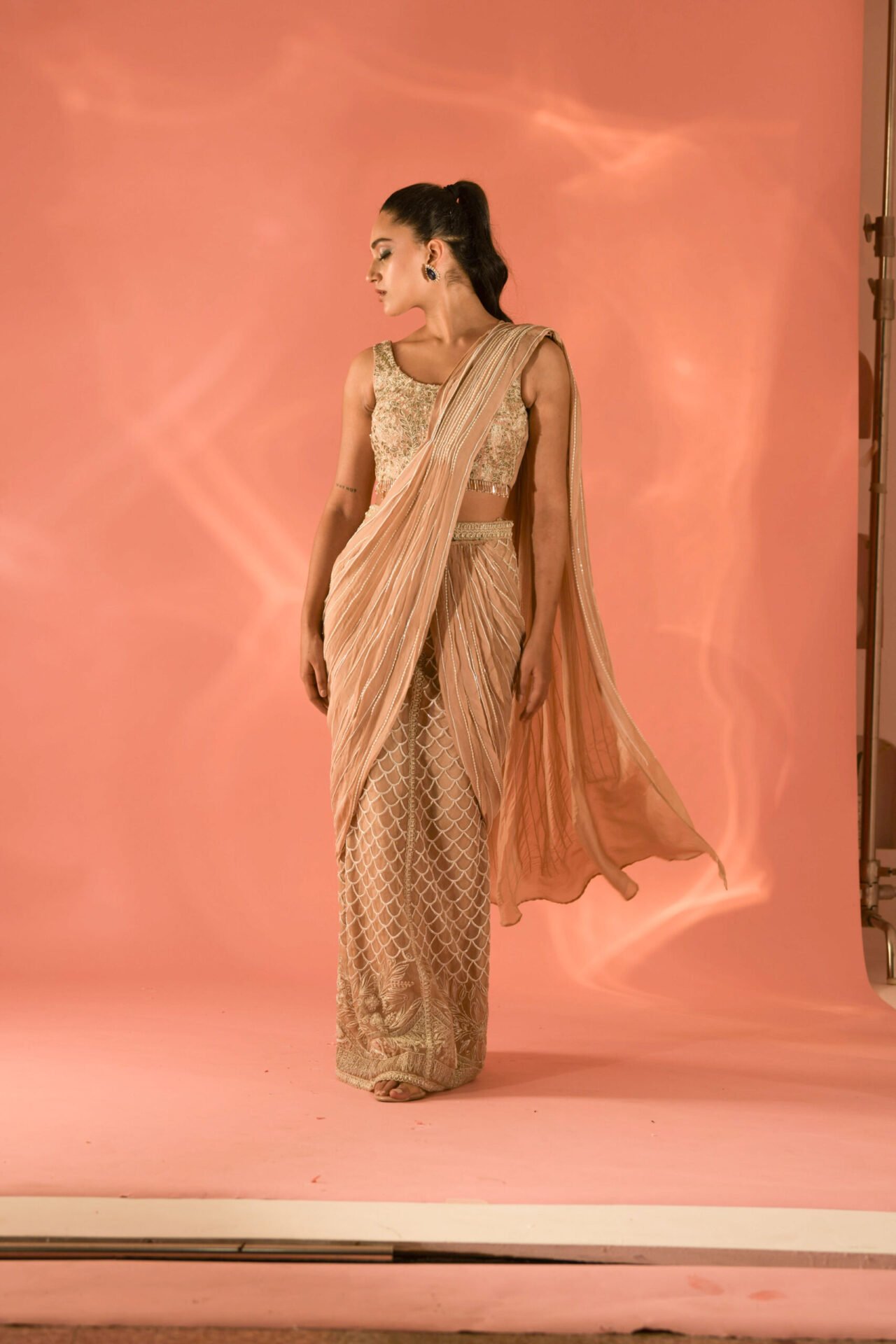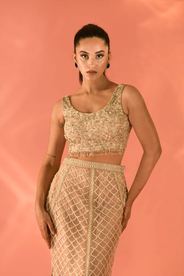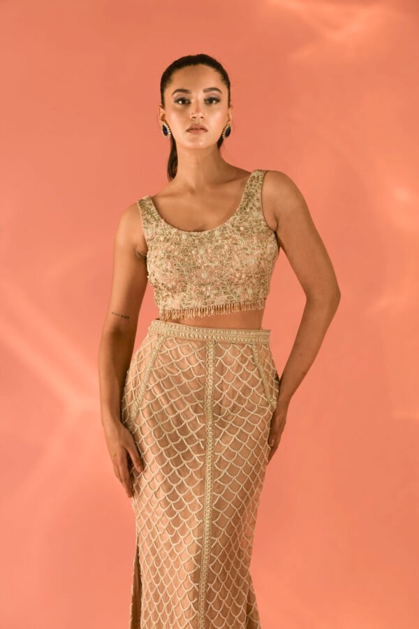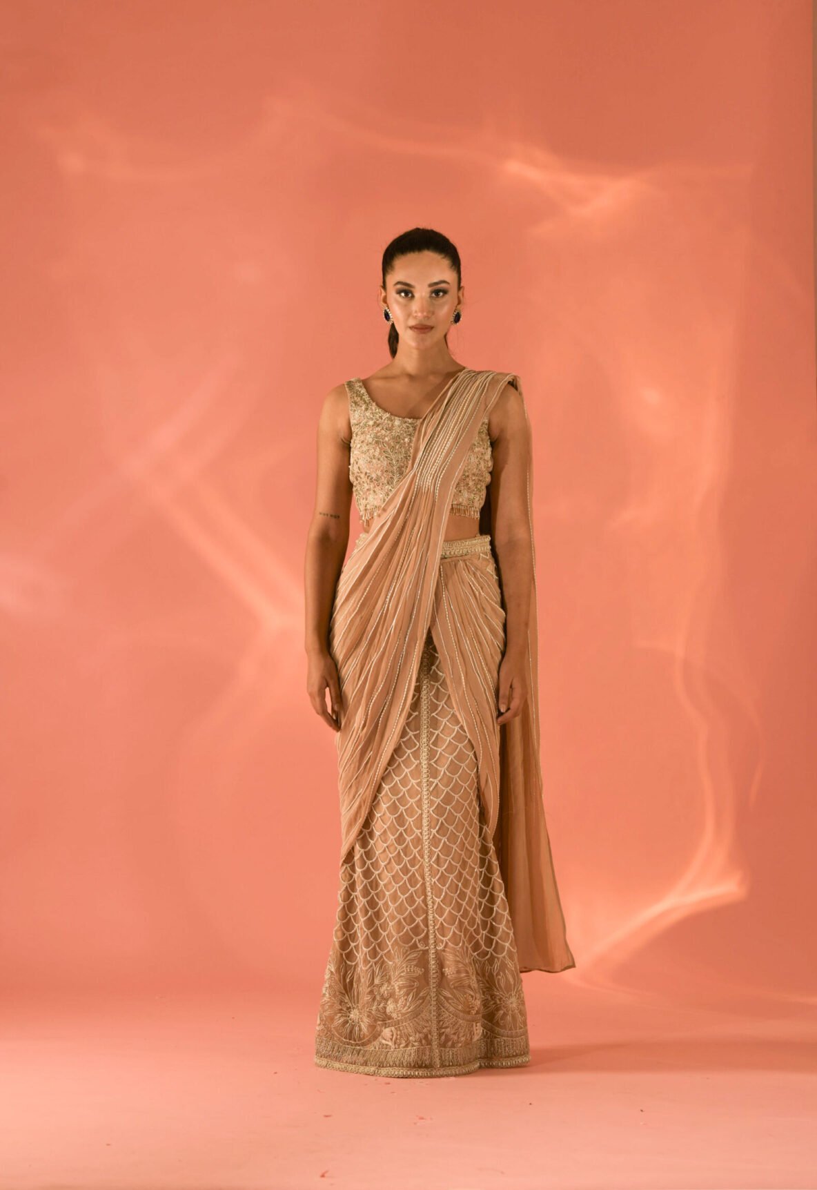 Featuring Dori and pearl embellished blouse with hand embroidered fish cut skirt and pre-draped palla