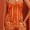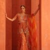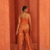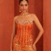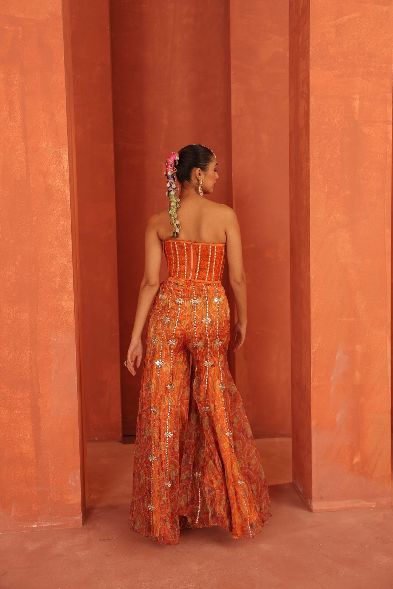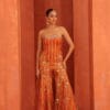 A sculpted orange corset with intricate mirror work and delicate organza mesh paired with a dramatic flared sharara. The ensemble merges contemporary corsetry with traditional craftsmanship