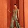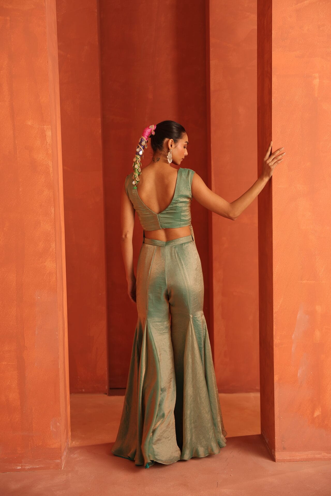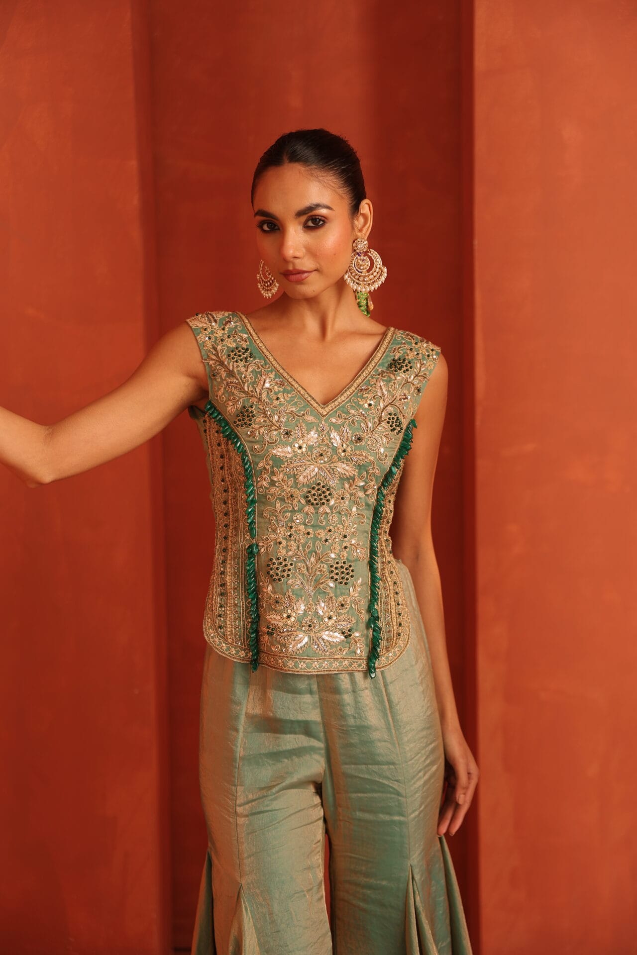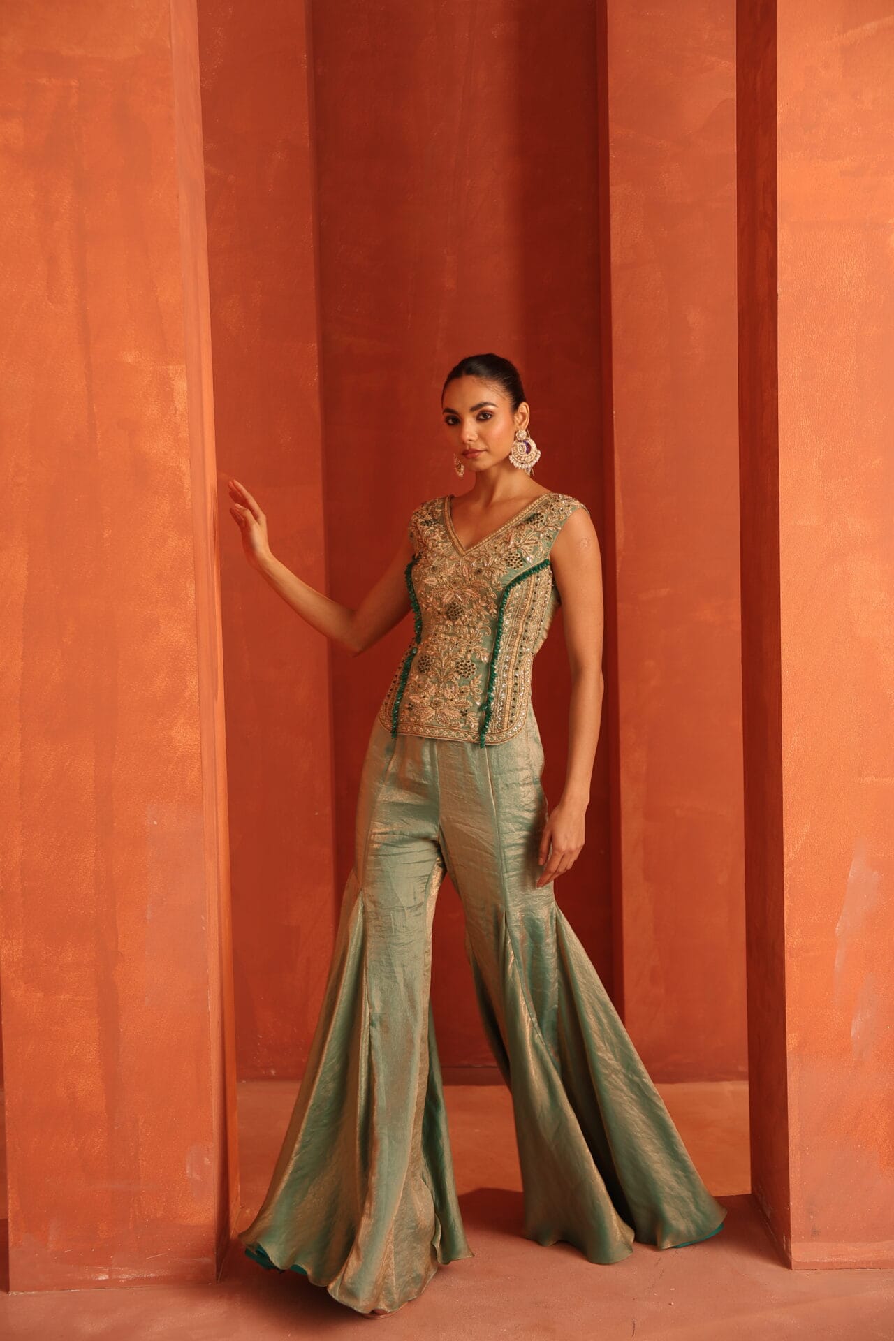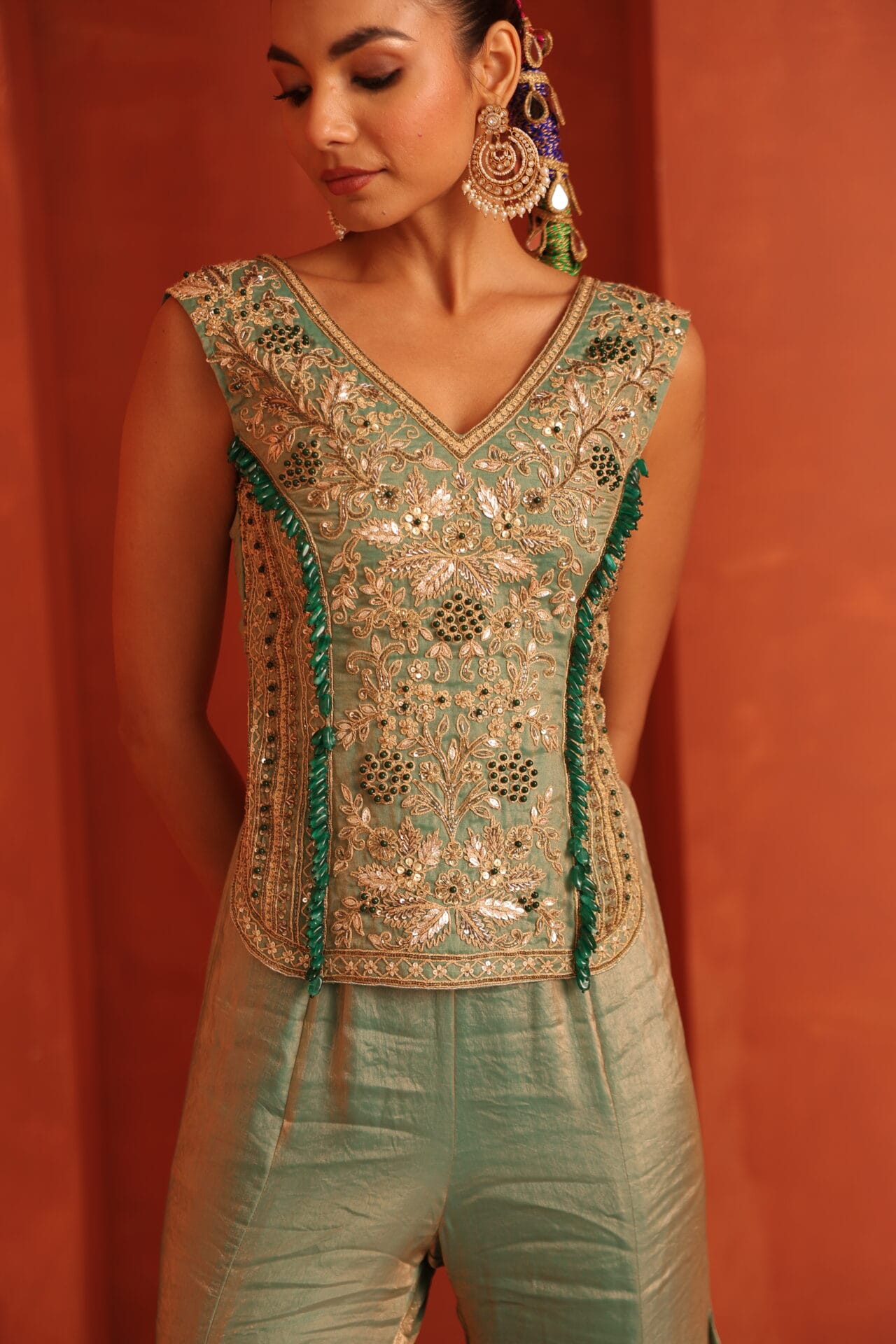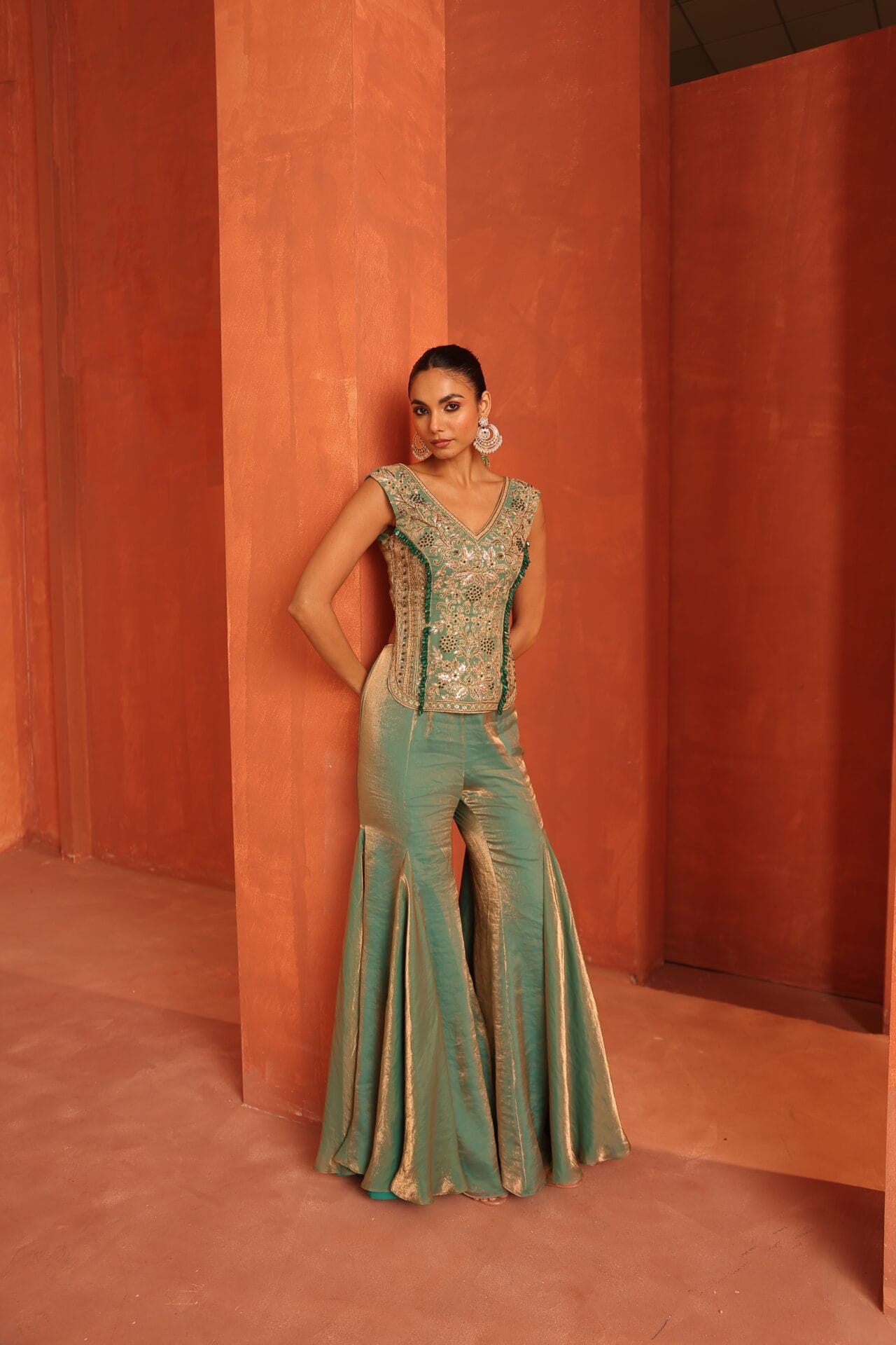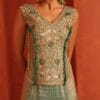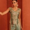 Blue tissue top highlighted with intricate jewellery inspired embroidery in gold tones accentuated with green stones tassels,Paired with a fluid sharara designed to add movemnet and balance to the structured embroidery creating a festive sillouette.