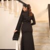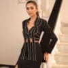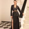 Statement black tailored jacket adorned with stud embroidery, paired with a sleek fish cut skirt featuring a bold slit. The structured jacket adds sharp sophistication, while the mermaid silhouette skirt enhances curves and flares elegantly at the hem. The slit introduces a modern, confident edge, making this look perfect for high-impact evening styling.
