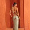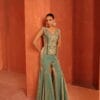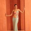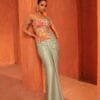 A sculpted multicoloured corset enriched with intricate hand embroidery paired with a fluid blue glitter fabric drape. Theensemble blends vibrant surface artistry with contemporary corsetry creating a dramatic couture silhouette.